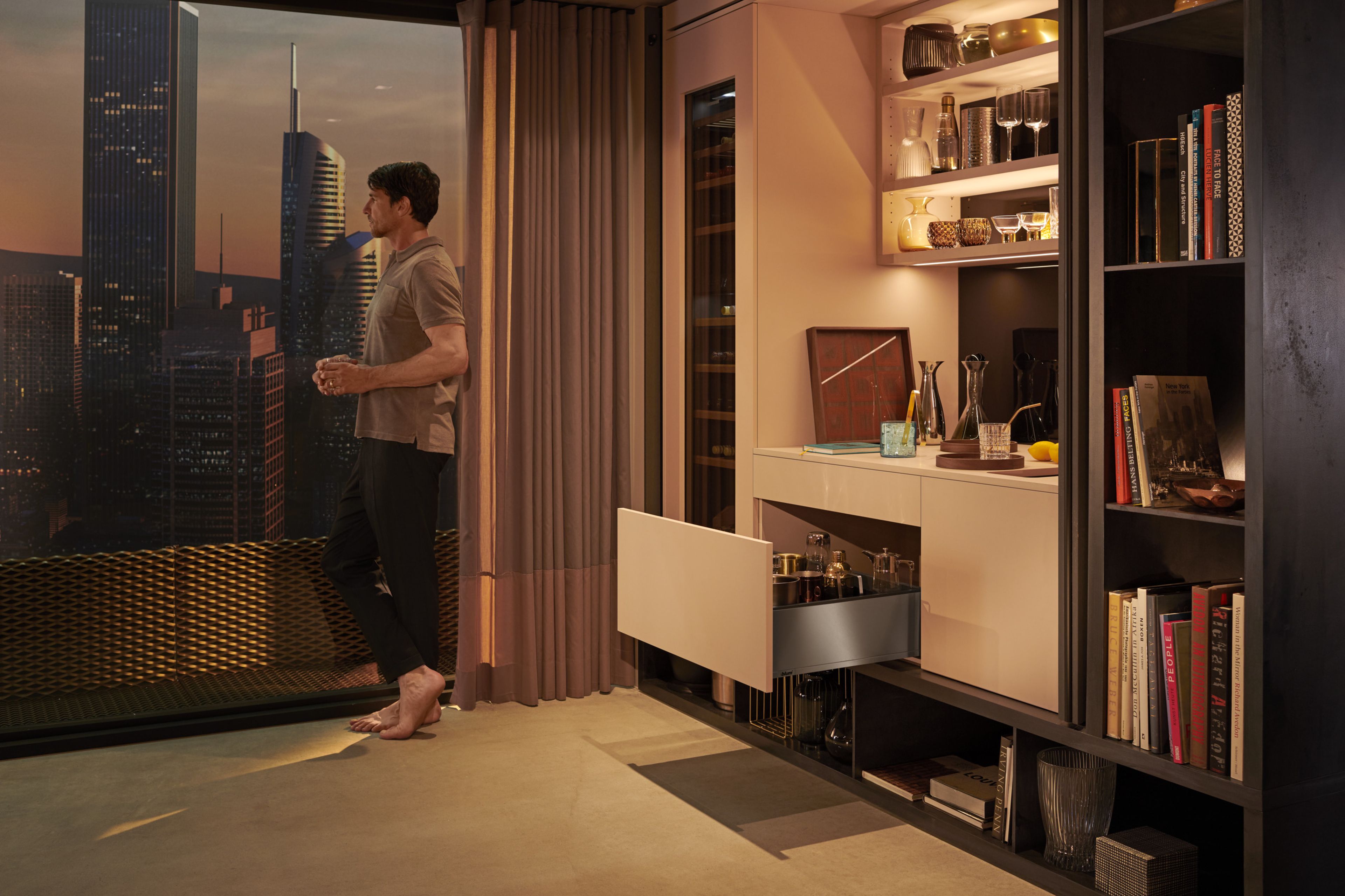 Mit von Blum ist beispielsweise ergänzend zum äußeren Design auch das Erscheinungsbild von Schubladen individuell gestaltbar. Aus einer Vielfalt von Farben, Materialien, Drucken und Gravuren lassen sich richtige Unikate kombinieren. Die doppelwandigen Seiten erlauben es, prägnante Designmerkmale des umgebenden Raums im Schubladeninneren aufzugreifen oder durch einen bewussten Kontrast raffinierte Akzente zu setzen.