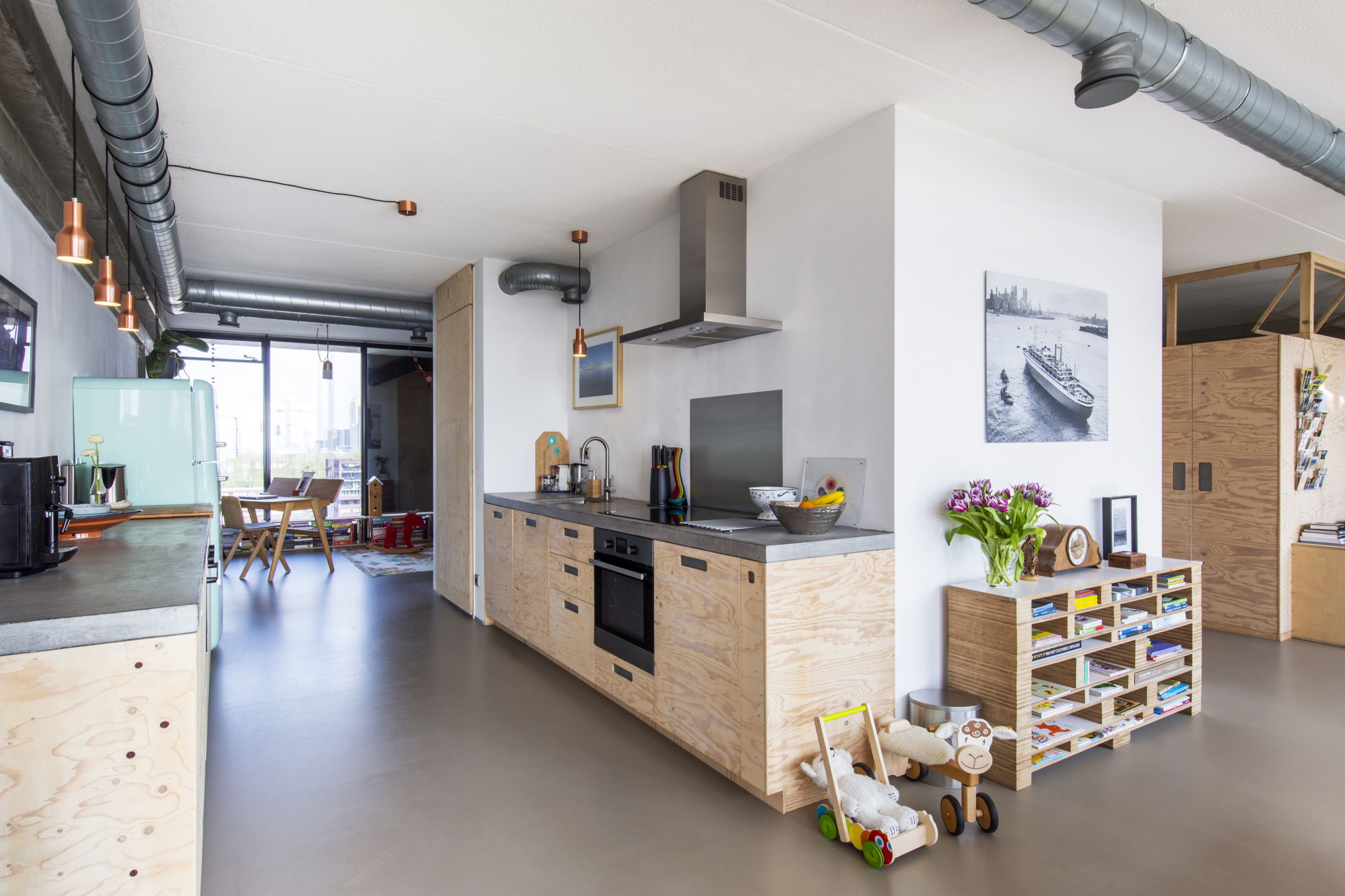 キッチンをすっきりとした印象にしたい場合は、大きなアイテムを収納できるスペースもあります。ゴミ箱は簡単に引き出せますが、高い前板の後ろに隠れたままになります。