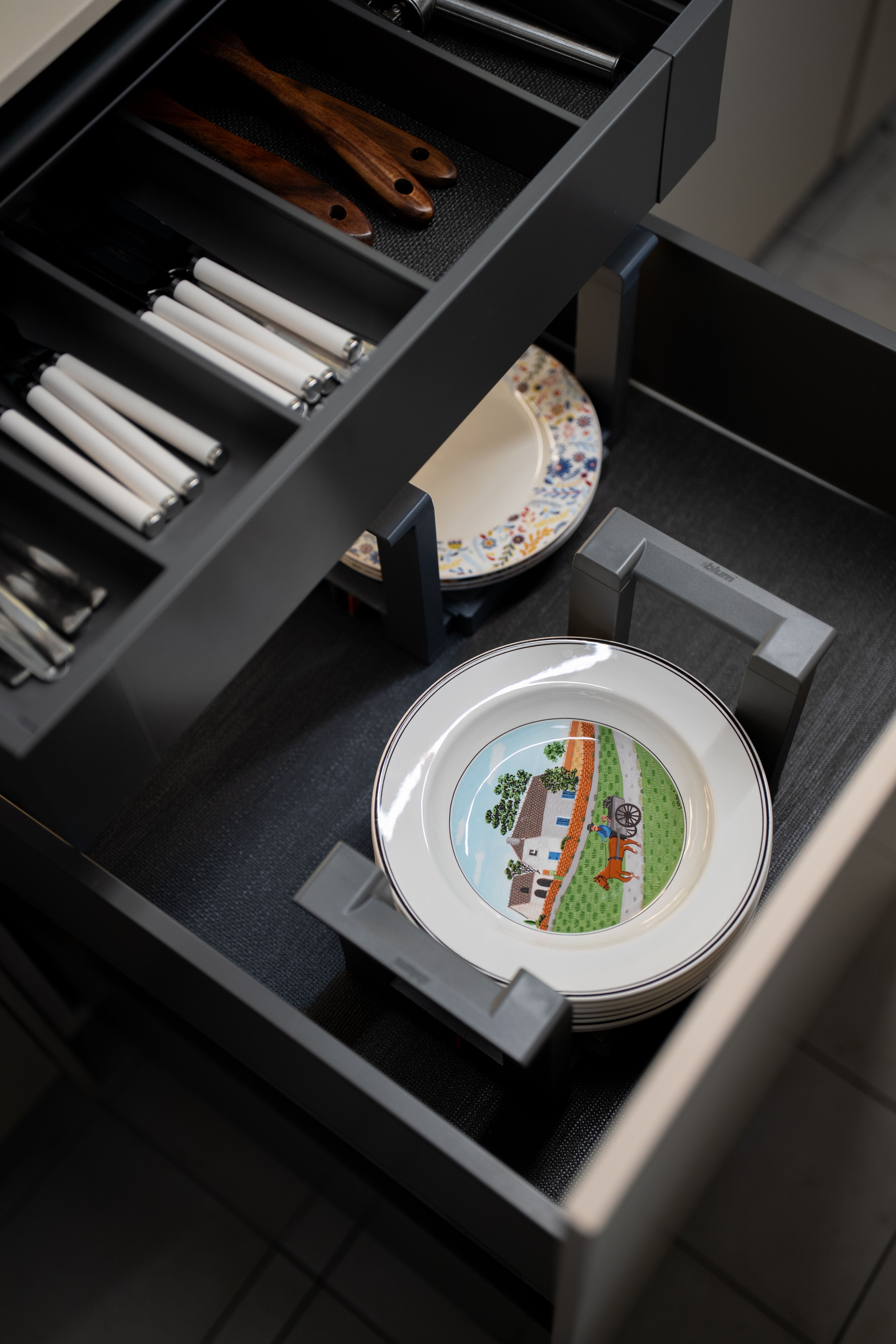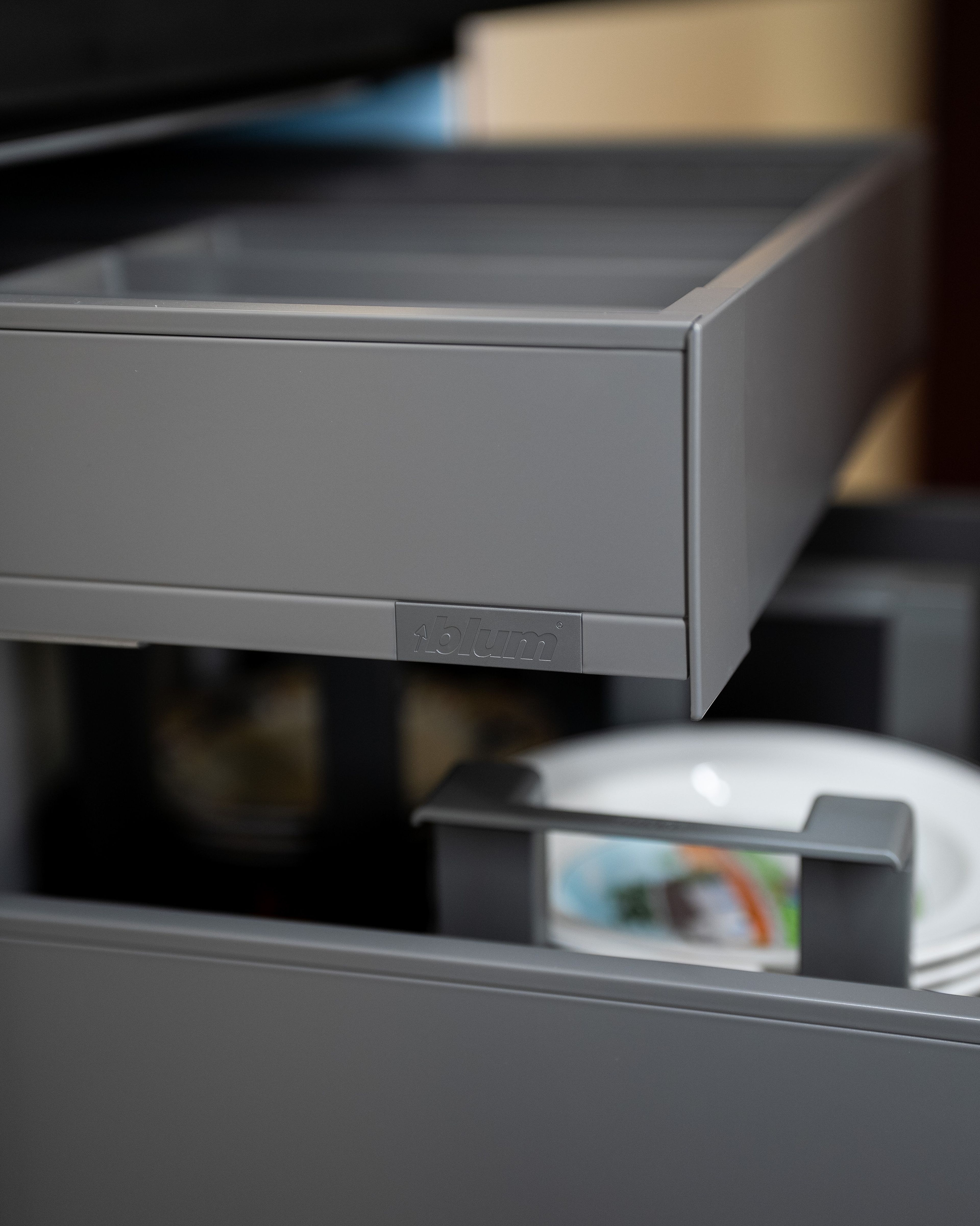 Kuchnia jako serce domu: Dzięki rozwiązaniom Blum, takim jak LEGRABOX, SPACE TOWER, REVEGO i SERVO-DRIVE kuchnia stała się funkcjonalna, estetyczna i przygotowana na codzienne wyzwania, jednocześnie zachowując przytulny, rodzinny charakter.
