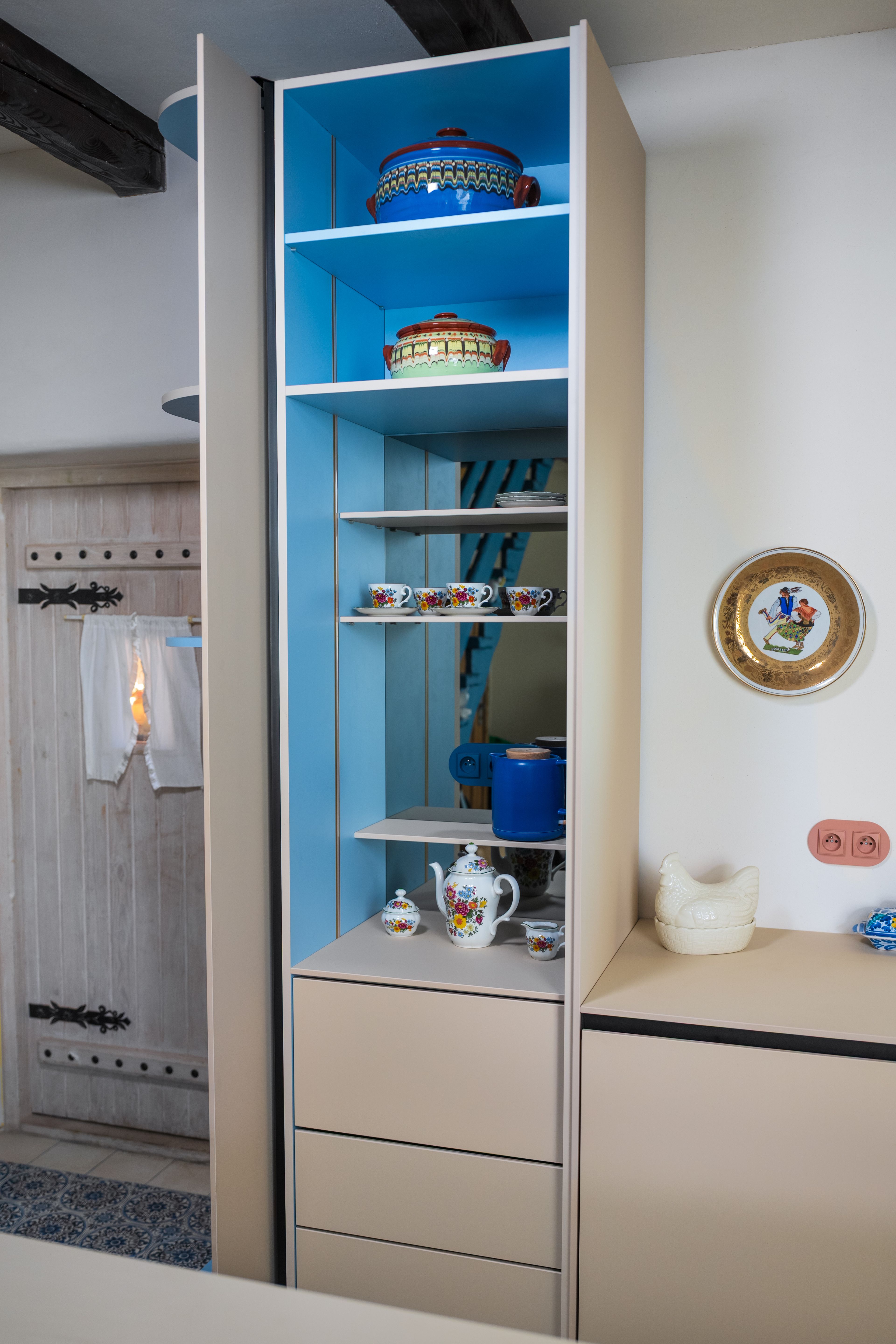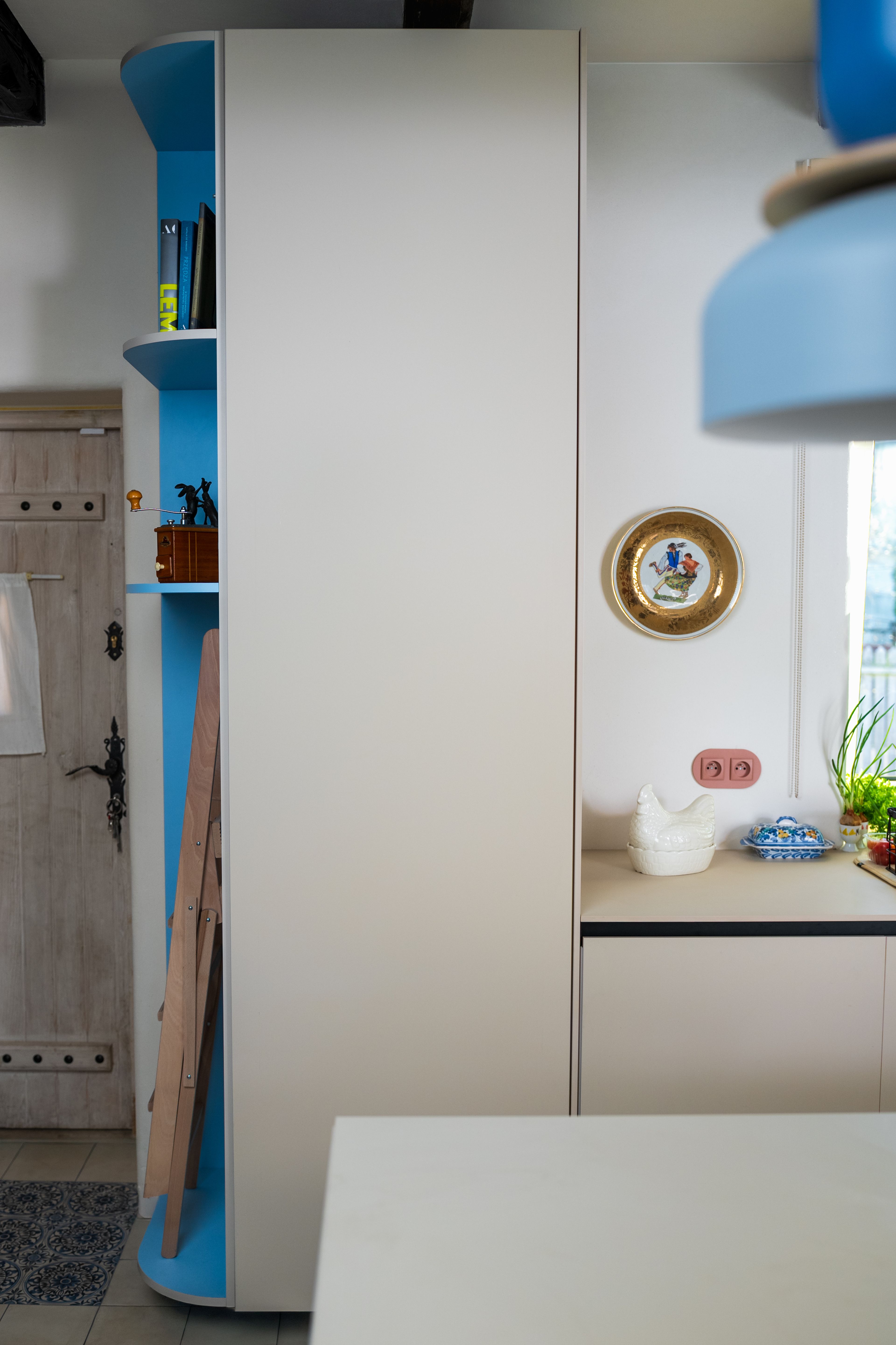 Choć dom Joanny zachował swój dawny charakter, kuchnia zyskała nowoczesne rozwiązania. Szuflady LEGRABOX pozwalają przechowywać ciężkie zapasy, system SPACE TOWER daje wygodny dostęp do produktów, a SERVO-DRIVE umożliwia otwieranie szuflad bez użycia rąk.